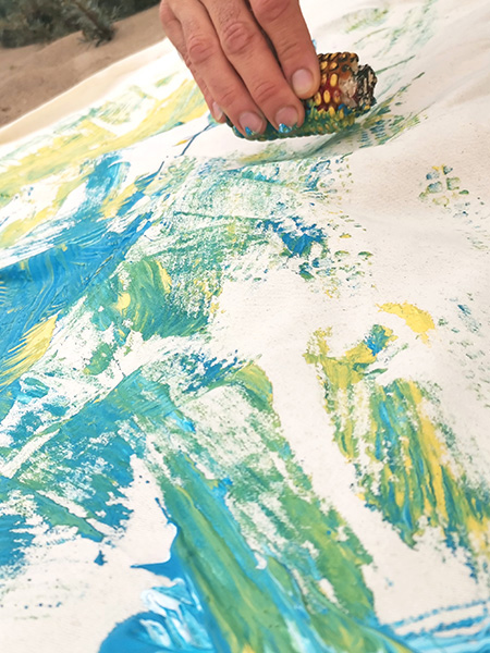 Morgen existiert noch nicht. Wenn es morgen ist, sind wir wieder im Jetzt. Gestern war ein Moment im Jetzt. Also lasst uns lachen und tanzen – jetzt. Sorgen bringen nur weitere Sorgen. Was will ich geben, mir und der Welt. Lasst uns reflektieren, Fragen stellen und ausprobieren, so wie Alexander einfach mit der Maiskolbe und Sand experimentiert hat. Das fertige Bild heißt Erlösung. In den Momenten des Kreierens hat er seine Gefühle mit Farbe und Körperbewegungen in den Dünen Hollands ausgedrückt. Und das tat gut sagt er.